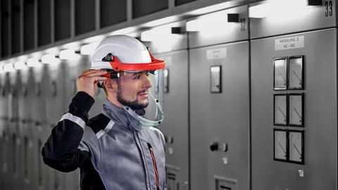Schermi di protezione testati contro l'arco elettrico con alta trasparenza per lavorare in sicurezza negli impianti elettrici. Certificati secondo il regolamento DPI (UE) 2016/425 per la commercializzazione dei dispositivi di protezione individuale. Cappuccio di protezione per una protezione completa di viso, testa e collo. Caschi di protezione per elettricisti per l'installazione degli schermi di protezione e del cappuccio di protezione.