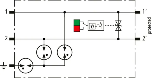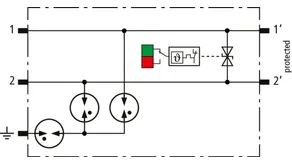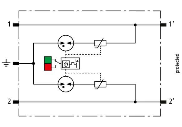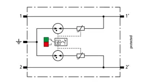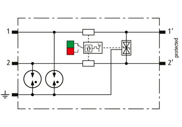 Platzsparender, modularer Kombi-Ableiter in 6 mm Baubreite und Push-In Anschlusstechnik mit Statusanzeige zum Schutz von 1 Doppelader in 24 V DC Systemen. Einsatz geeignet auch bei geerdetem Minuspol, integrierte PTC-Widerstände ermöglichen ein sicheres Rücksetzen des Ableiters nach Störbeeinflussung im Anlagenkreis mit Kurzschlussströmen bis 40 A. Mit Signaltrennung für Wartungszwecke.